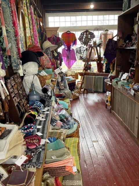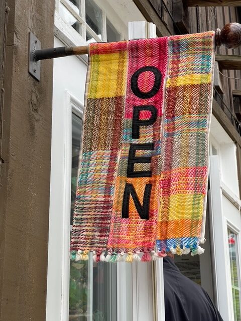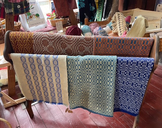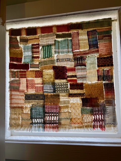 The windows are filled with woven samplers by children and experts; everywhere you look there are spindles, table looms, patterns, skeins of yarns, spinning wheels and dye materials….and people weaving and celebrating this ancient form of hand work.