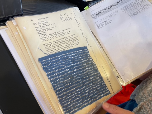 Known as drafts, they are veritable ‘blueprints’ for setting up a loom, the warps, wefts, heddles, tie-ups, draw-downs….it’s mathematical and exacting. The shelves are heavy with the collection of historic weaving drafts amassed over the years by Lou Tate.